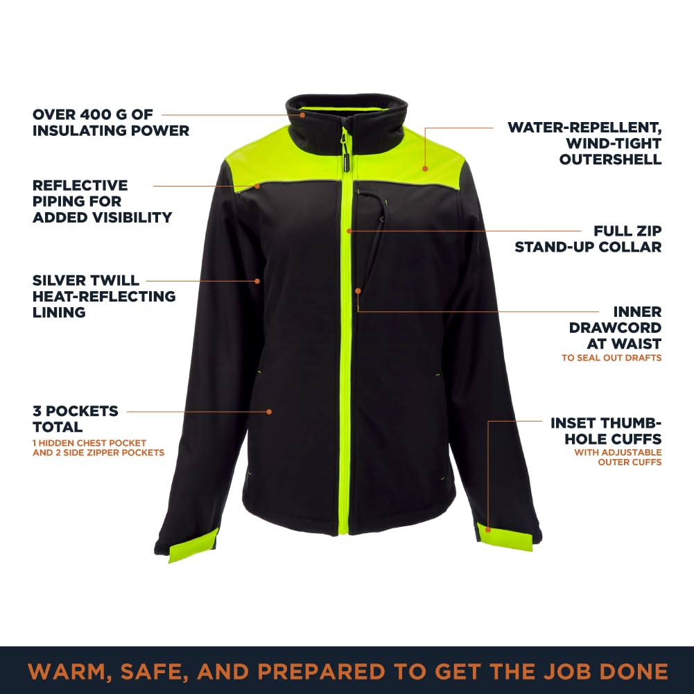 - INSULATED WORK GEAR: Keep the frigid temps out while you work. This high-visibility softshell women’s safety jacket features a water-resistant and wind-tight outer layer and a silver twill heat-reflecting lining to keep the warmth in.